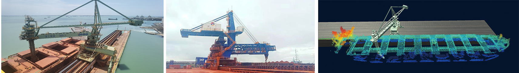 該系統(tǒng)具備船型掃描實時成像、多種船型定位識別、艙內(nèi)取料智能決策、三維可視化場景還原等功能,相比其他散貨船型識別算法通用性更強,基于設(shè)備運動學模型、有限元模型,構(gòu)建了融合幾十種取料工藝策略的決策分析系統(tǒng),形成多目標優(yōu)化后的取料工藝策略,艙內(nèi)智能化取料覆蓋率可達80%以上。另外,VR仿真平臺可實現(xiàn)工藝虛擬仿真,大幅減少現(xiàn)場調(diào)試時間。