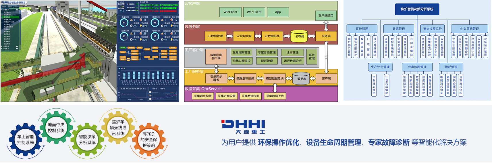 大連重工擁有焦?fàn)t機(jī)械專業(yè)化生產(chǎn)基地,設(shè)計(jì)、生產(chǎn)、制造的智能化焦?fàn)t機(jī)械設(shè)備已經(jīng)實(shí)現(xiàn)脫離操作或值守人員,按照生產(chǎn)計(jì)劃在無人操作模式下自動(dòng)運(yùn)行,具備危險(xiǎn)源識(shí)別、智能決策、故障預(yù)防、故障報(bào)警停機(jī)等功能,可向客戶提供環(huán)保操作優(yōu)化、設(shè)備生命周期管理、專家故障診斷等智能化解決方案。