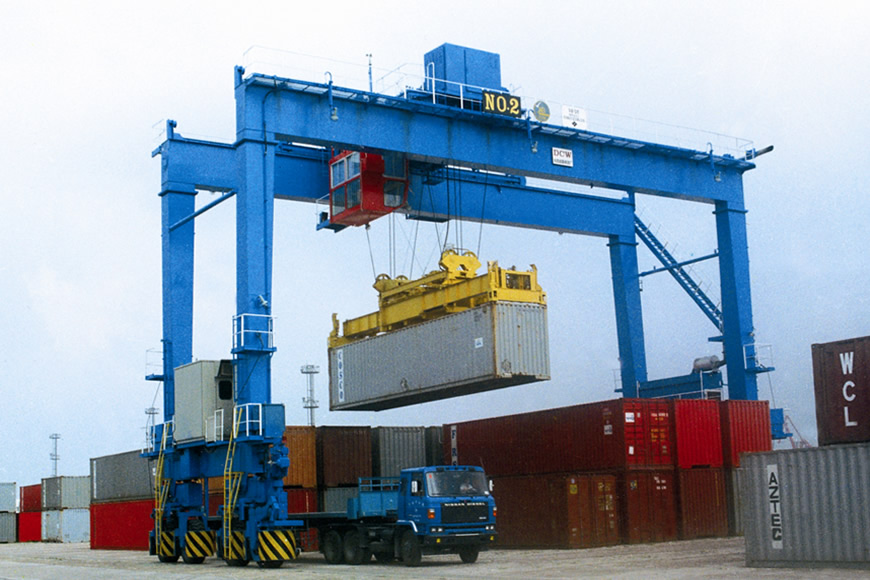 輪胎式集裝箱門式起重機(jī)方面,大連重工研制的該類產(chǎn)品適用于國際標(biāo)準(zhǔn)集裝箱的搬運(yùn)及裝卸,設(shè)備性能先進(jìn),機(jī)動性好,對地面不平度敏感性小。目前產(chǎn)品主要機(jī)型為吊具下30.5噸—45噸。